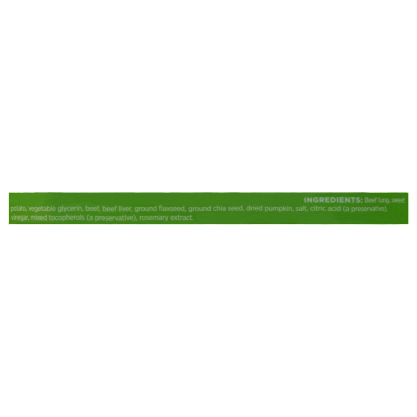 ingredients : beef liver;beef lung;sweet potato;vegetable glycerin;beef;ground flaxseed;ground chia seed;dried pumpkin;salt;citric acid (a preservative);vinegar;mixed tocopherols (a preservative);rosemary extract