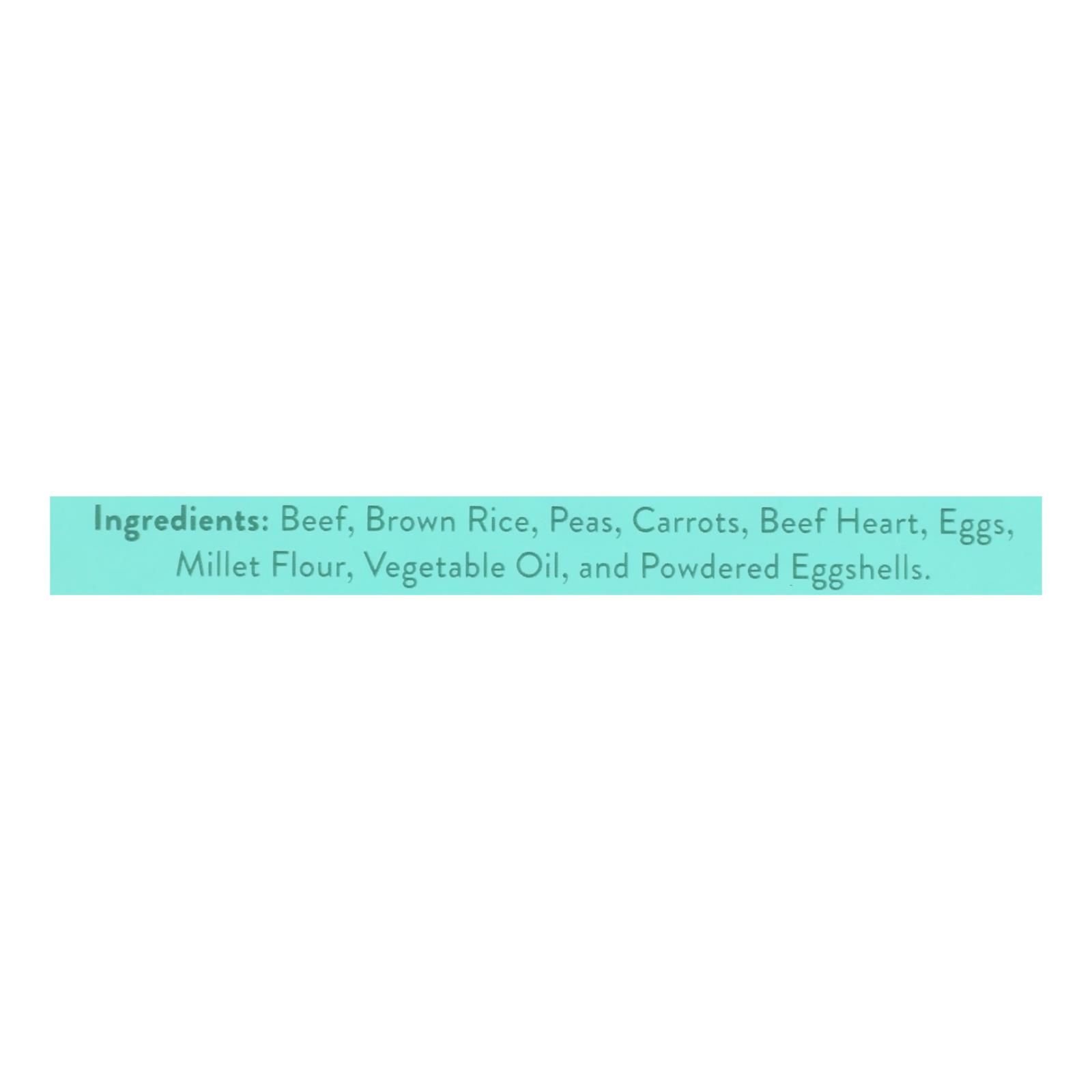 ingredients : beef;brown rice;peas;carrots;beef heart;eggs;millet flour;vegetable oil;and powdered eggshells