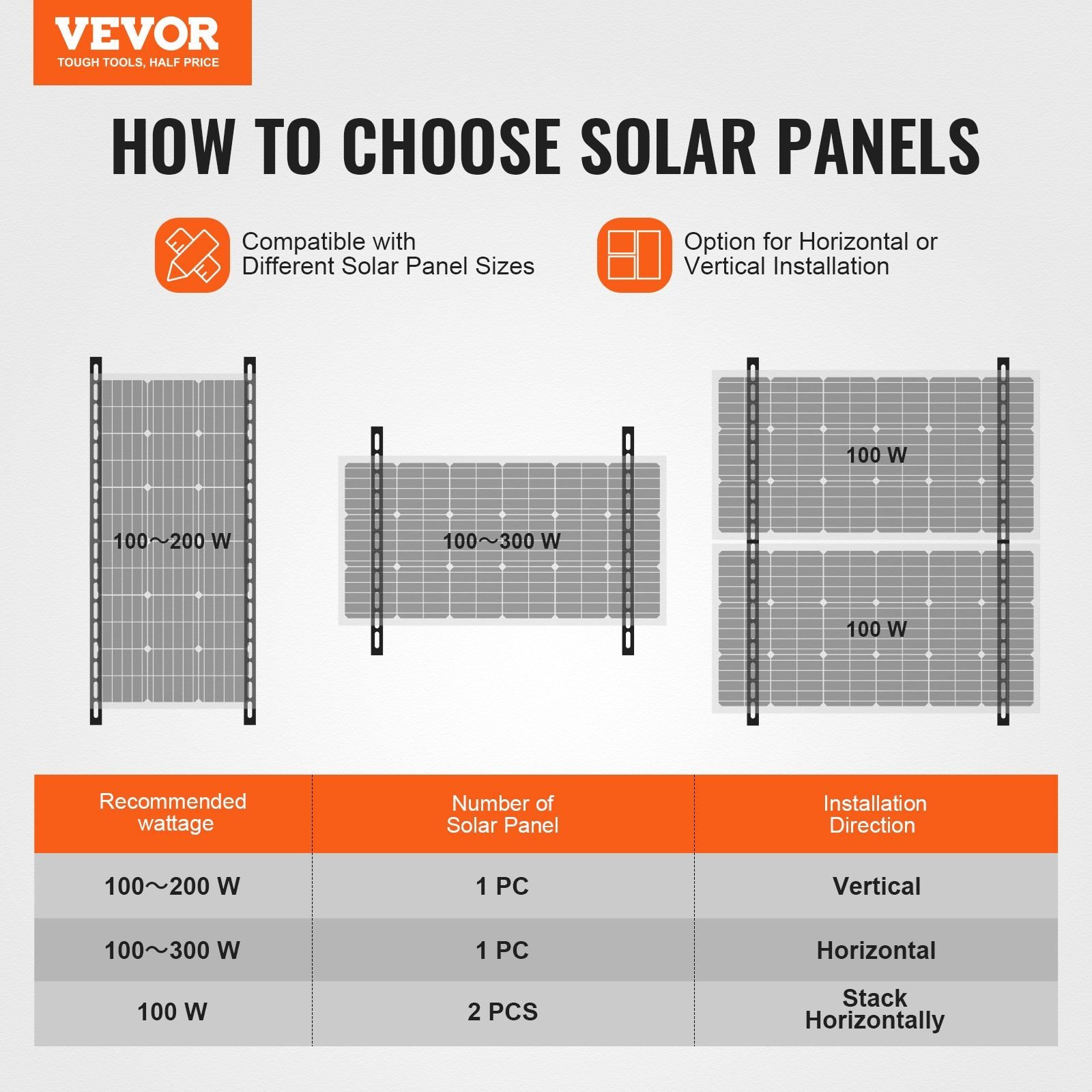 1.0-90° Flexible Adjustment: The VEVOR 41-inch solar panel mount brackets are compatible with 100-300W solar panels. With 0-90° adjustable angle, you can easily set the solar panels to optimal position, maximizing sunlight exposure and enhancing overall energy efficiency.